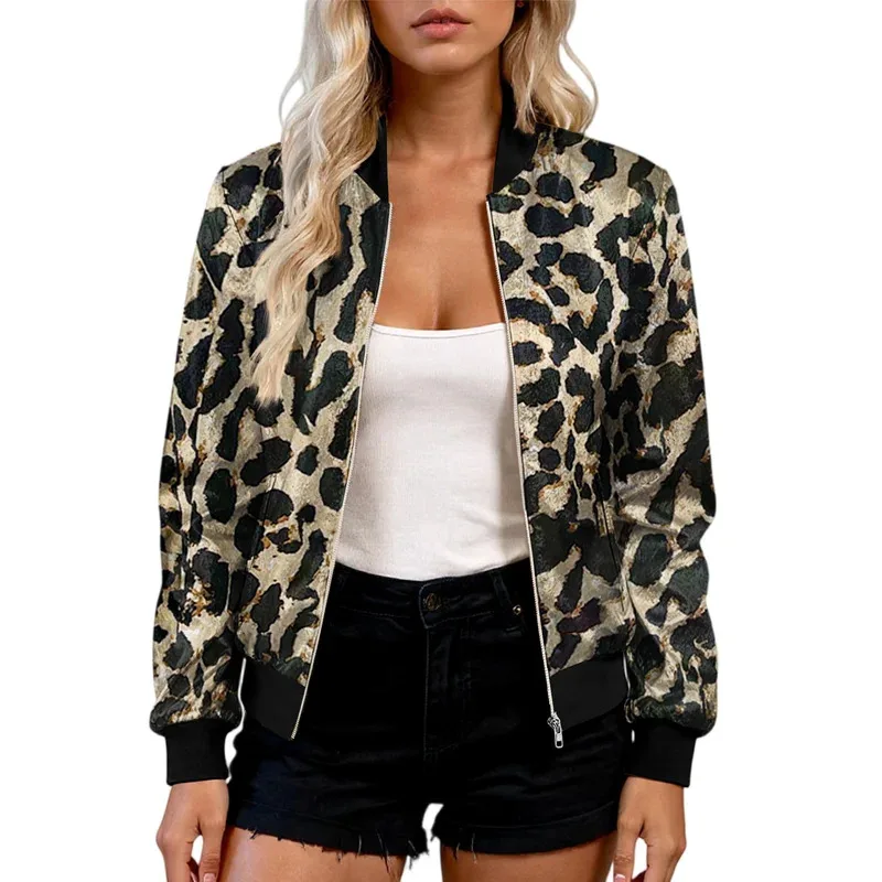 This classic bomber-style jacket features a bold leopard print and a full-front zipper. Designed with a ribbed collar, cuffs, and hem, it offers a comfortable fit and a stylish silhouette. Perfect for casual everyday wear or as a trendy outer layer for any season.