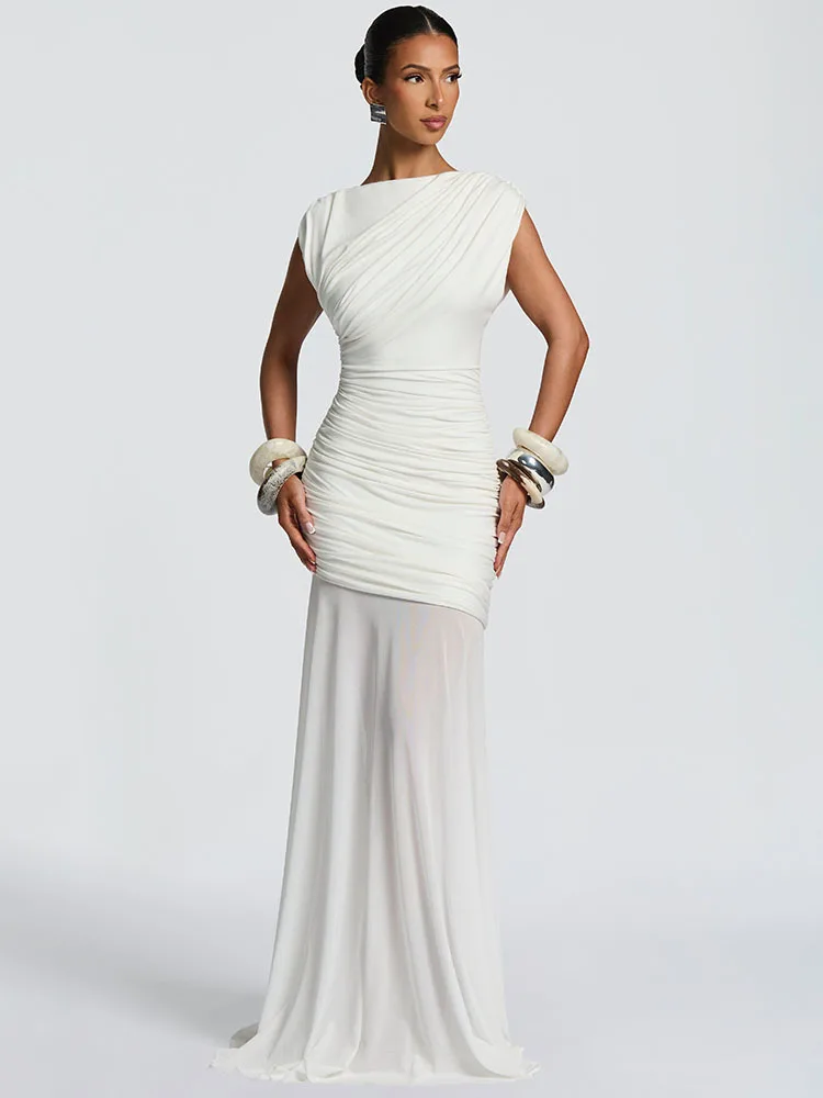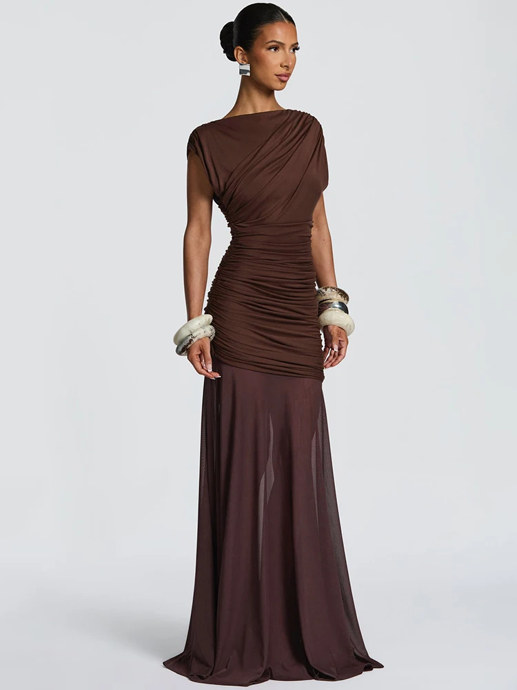 Elegant O-Neck Sleeveless Ruched Mesh Maxi Dress Slim Fit Floor-Length Evening Gown