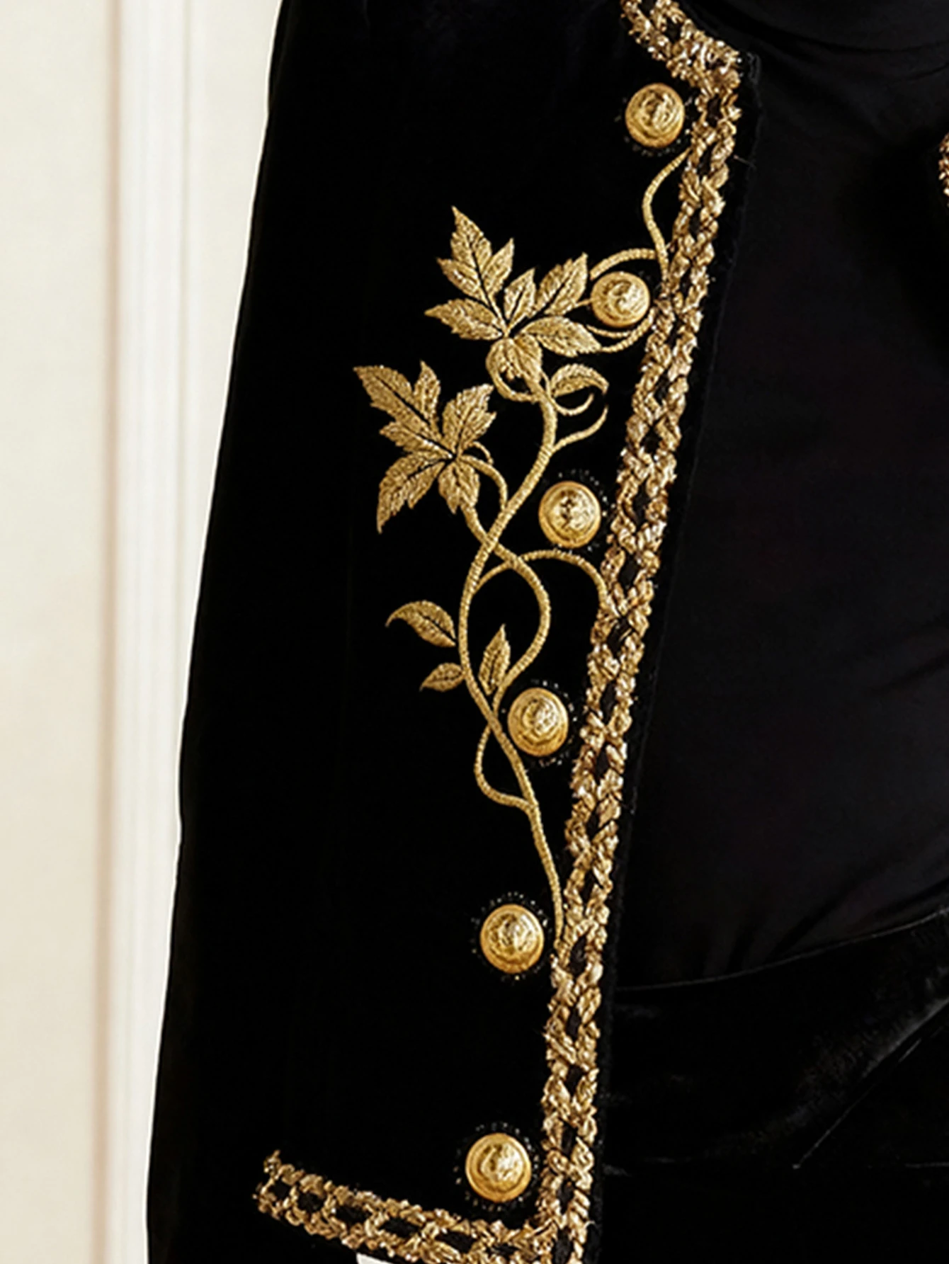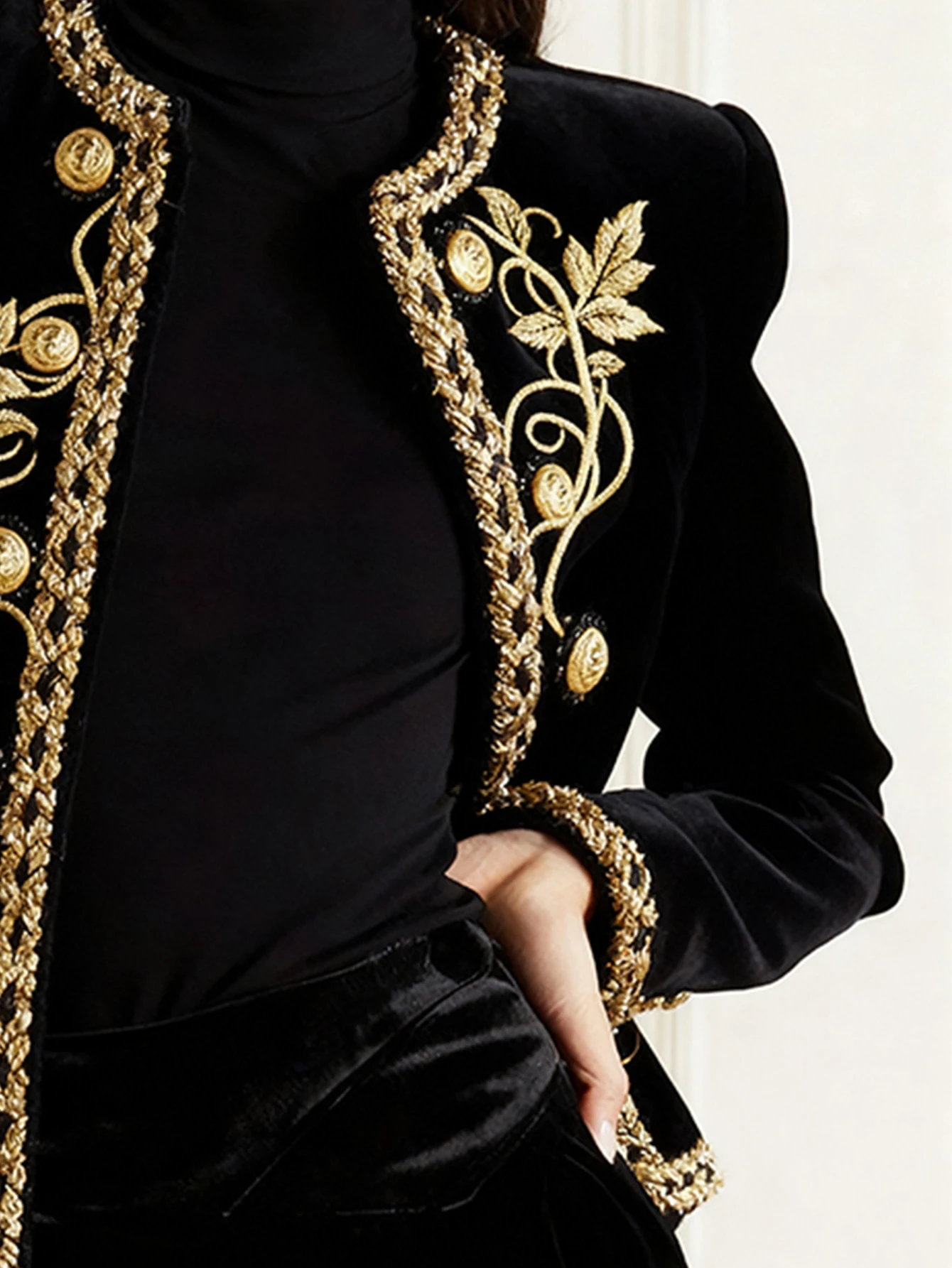 This elegant black jacket features intricate gold floral embroidery and braided trim along the edges and cuffs. Crafted from a soft, velvet-like material, it is designed with a structured silhouette, a round neckline, and prominent decorative gold-tone buttons. A vintage-inspired piece perfect for formal gatherings or elevating evening attire.