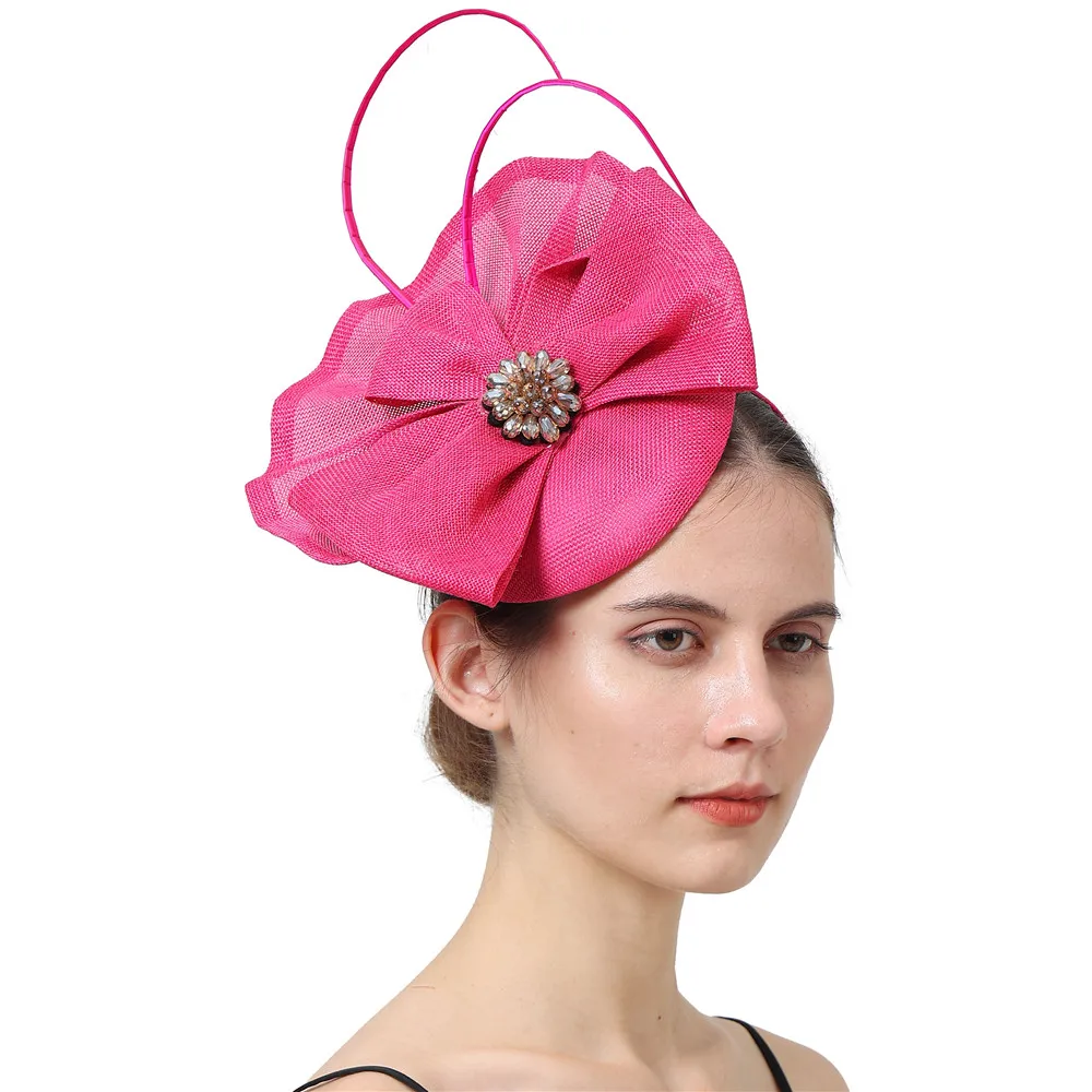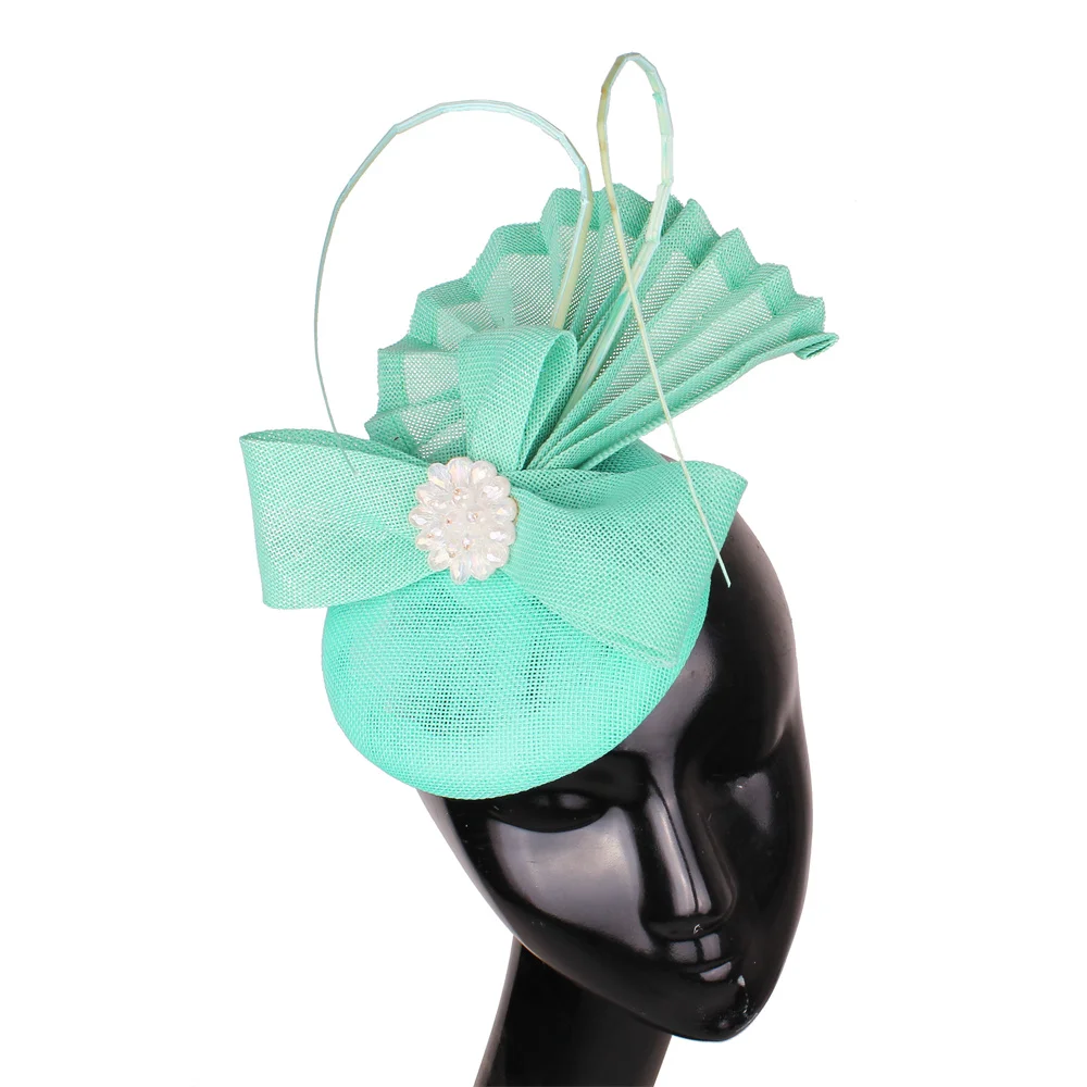 This elegant sky blue pillbox fascinator is crafted from textured mesh fabric, featuring a central floral jewel embellishment. Designed with graceful thin loops and a structured bow-like detail, it offers a sophisticated look for weddings, royal-themed events, or formal tea parties. Lightweight and secure for comfortable wear.