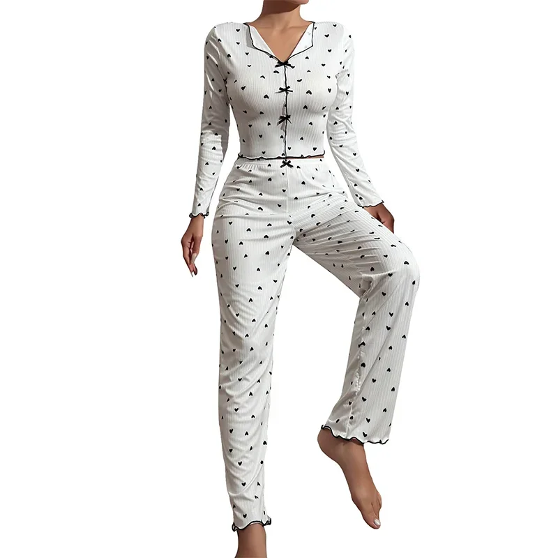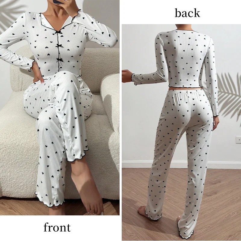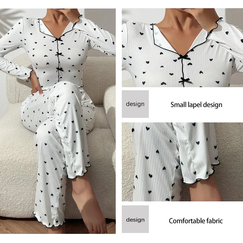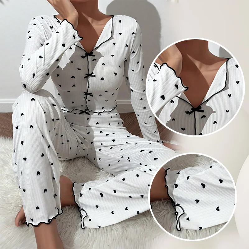 Women’s V-Neck Pajama Set with Heart-Shaped Printed Long Sleeved Paired with Long Pants and Lettuce Trimmed Women’s Pajama Set